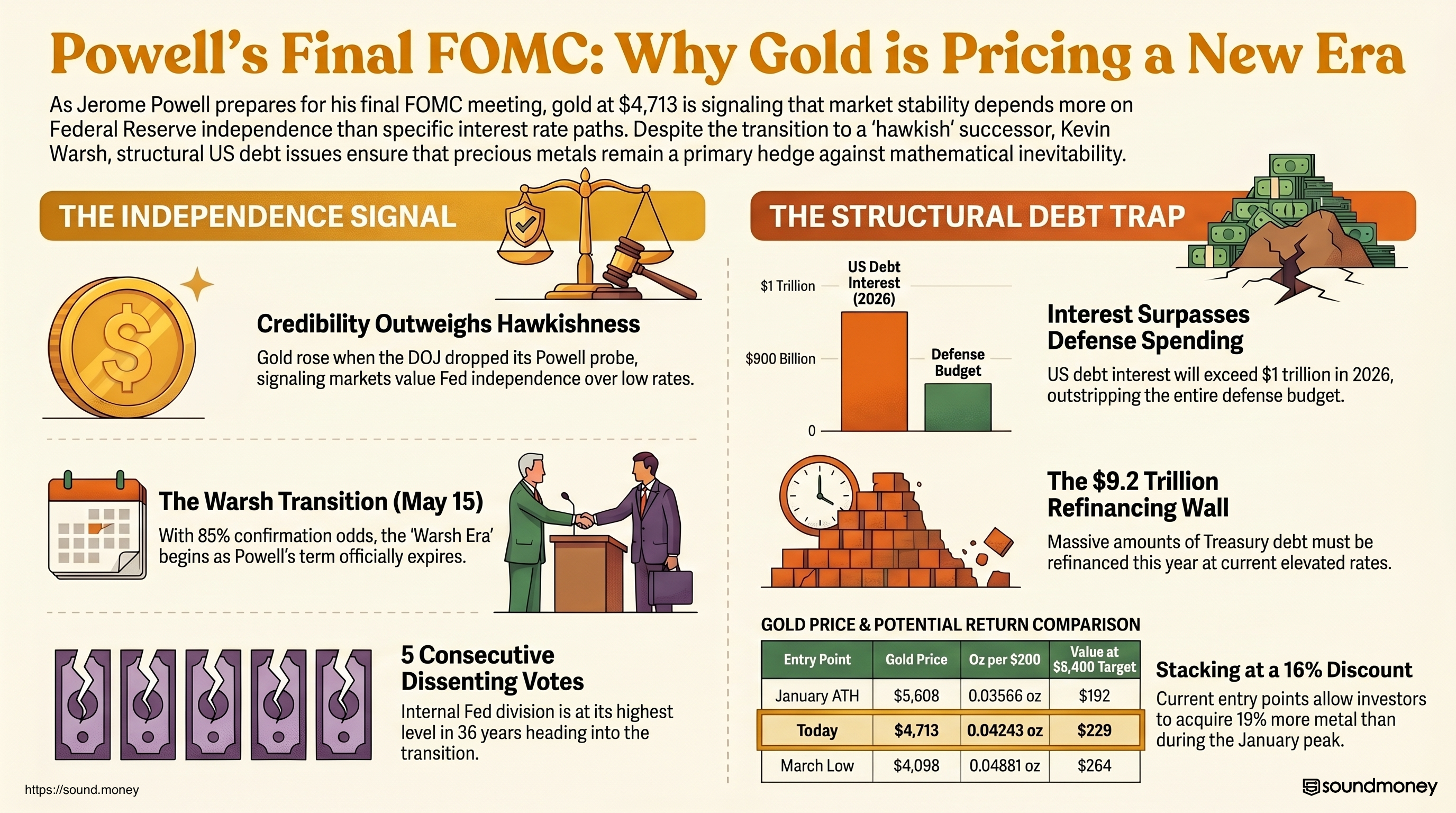 For the people who have been stacking through this cycle, none of this changes the calculus. You do not need to predict what Powell says tomorrow, or how Warsh will govern, or when Iran resolves. You need to understand the structural argument. US debt service exceeds defense spending for the first time in history. Central banks bought gold for the 17th consecutive year. Silver's sixth annual supply deficit approaches. Each $200 purchase today acquires 19% more gold than the same purchase at the January high.