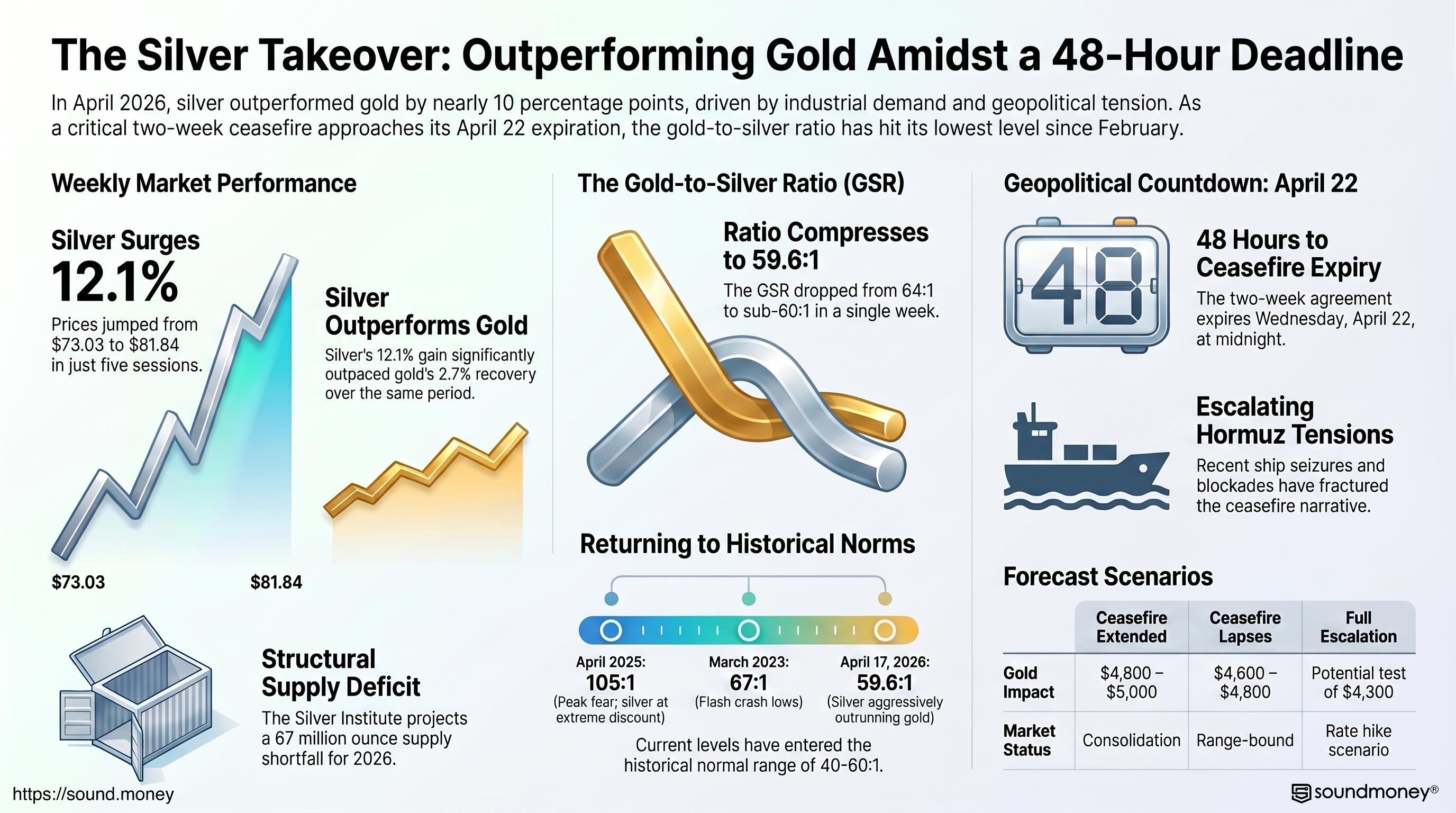 Silver gained 12.1% in five sessions -- from $73.03 on April 11 to $81.84 on April 17. Gold gained 2.7% over the same period. Silver outperformed by nearly 10 percentage points. The gold-to-silver ratio compressed from 64:1 to 59.6:1 -- its lowest since February 2026 and the fastest single-week compression since the crisis began.